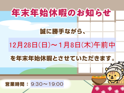 - 平素は格別のお引き立てをいただき厚く御礼申し上げます。 誠に勝手ながら下記日程を年末年始休業とさせていただきます。 ****************************************************** 【年末年始休業期間】 2025年12月28日(日) ~ 20...